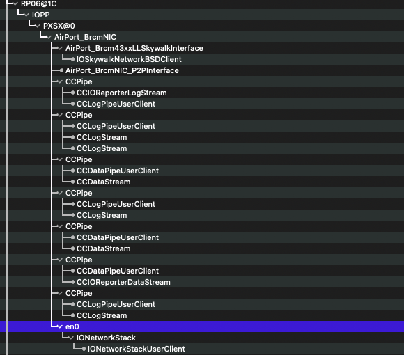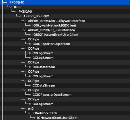 The result is the following: IORegistryExplorer correctly shows IOSkywalkFamily attached to the card itself: